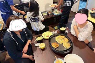 皆でホットプレートを囲みながら、お好み焼きを焼きました!
